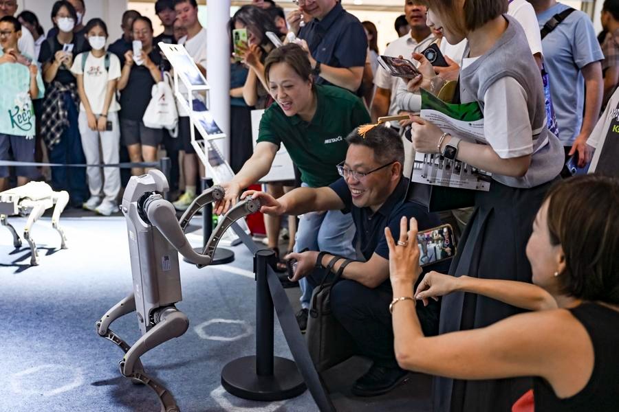 Посетителите си взаимодействат с куче робот на Световната AI конференция през 2025 г. в Шанхай в Източен Китай, 29 юли 2025 г. [Photo/Xinhua]