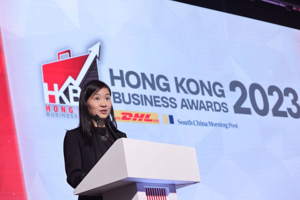 Catherine So, изпълнителен директор на SCMP, говори на годишната гала вечеря на DHL-SCMP Hong Kong Business Awards на 7 декември 2023 г. Снимка: Май TSE