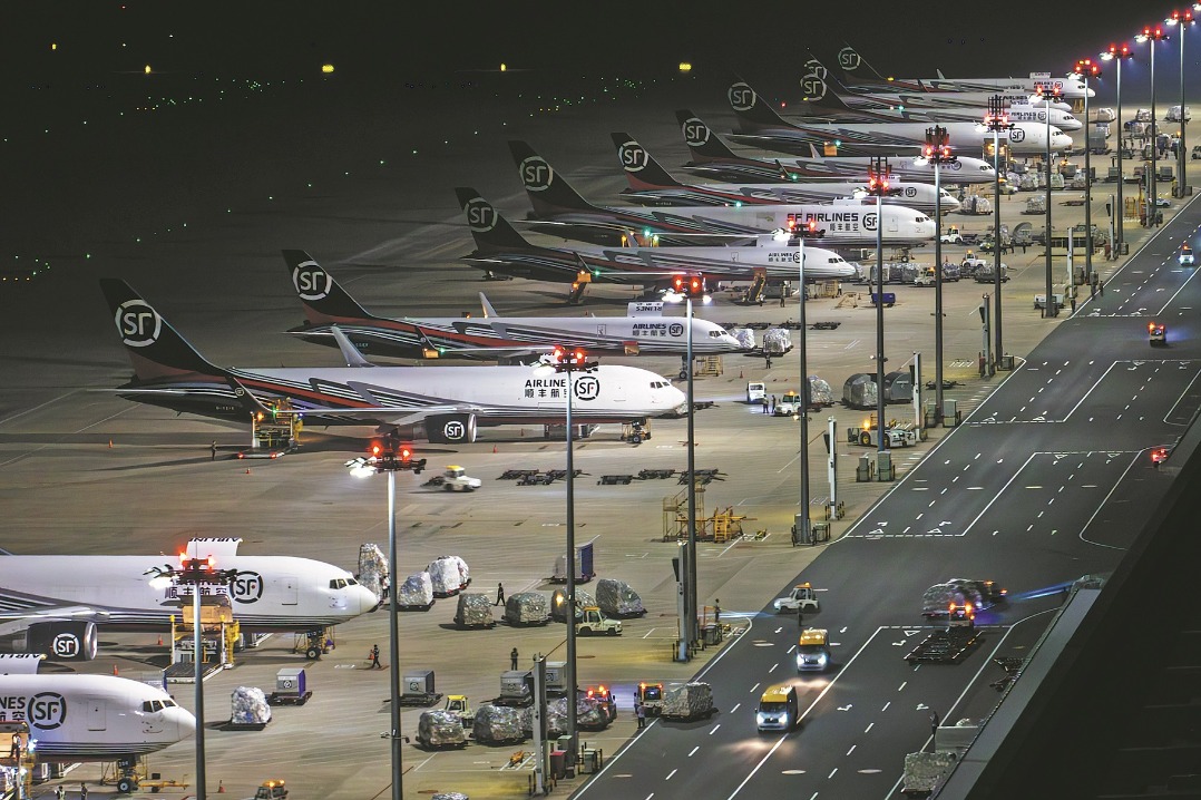 Самолетите на китайската логистична компания SF са забелязани на летище, предназначено за превоз на товари в Еджоу, провинция Хубей, на 11 юли. СЯО ИДЗИУ/СИНХУА