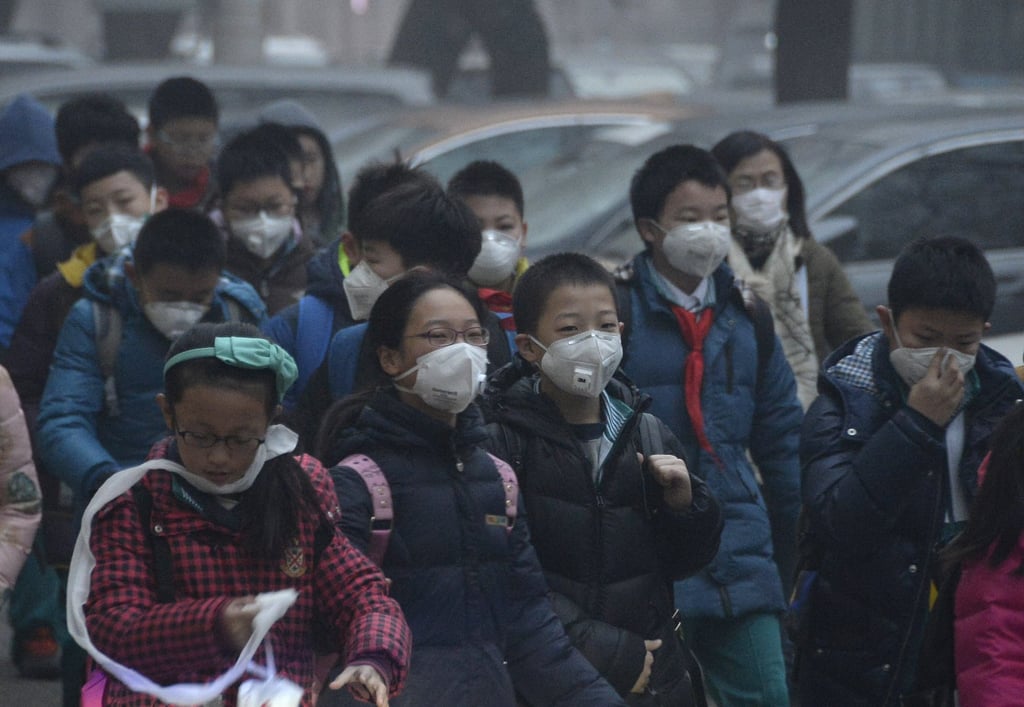 Студентите, носещи маски, се разхождат по смог улица в Пекин през 2015 г. Снимка: Xinhua