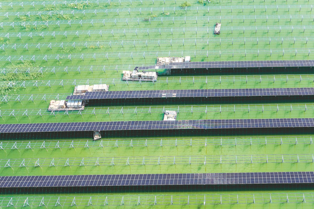 Работници инсталират слънчеви панели над рибарско езерце за развитие на зелена енергия в Юяо, провинция Джъдзян. [Photo/Xinhua]