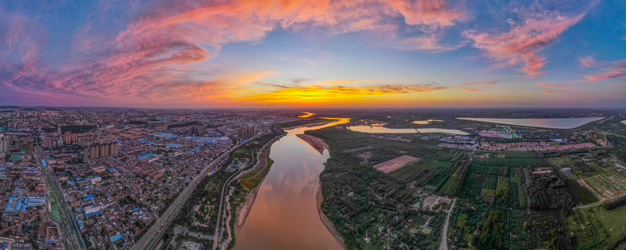 Живият залез хвърля ослепителна гама от цветове върху Жълтата река, която тече като жизненоважна спасителна линия през сърцето на Китай. КИТАЙ ДЕЙЛИ