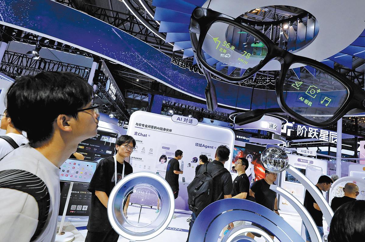 Посетителите се събират на щанда на компанията по време на изложение за интелигентни очила в Шанхай на 28 юли. ФАНГ ДЖЪ/СИНХУА