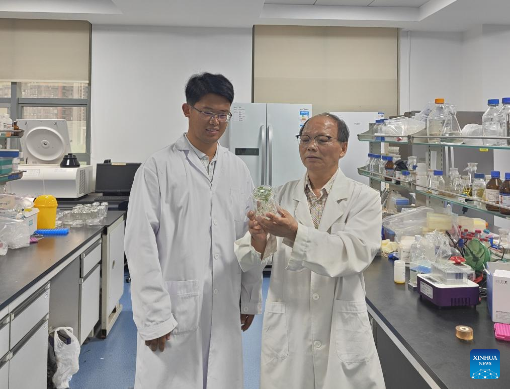 Тази недатирана снимка показва Лиу Лиджианг (L), главен учен на изследователския екип, работещ в Изследователския институт за нефтени култури на Китайската академия на селскостопанските науки в Ухан, провинция Хубей в Централен Китай. [Photo/Xinhua]