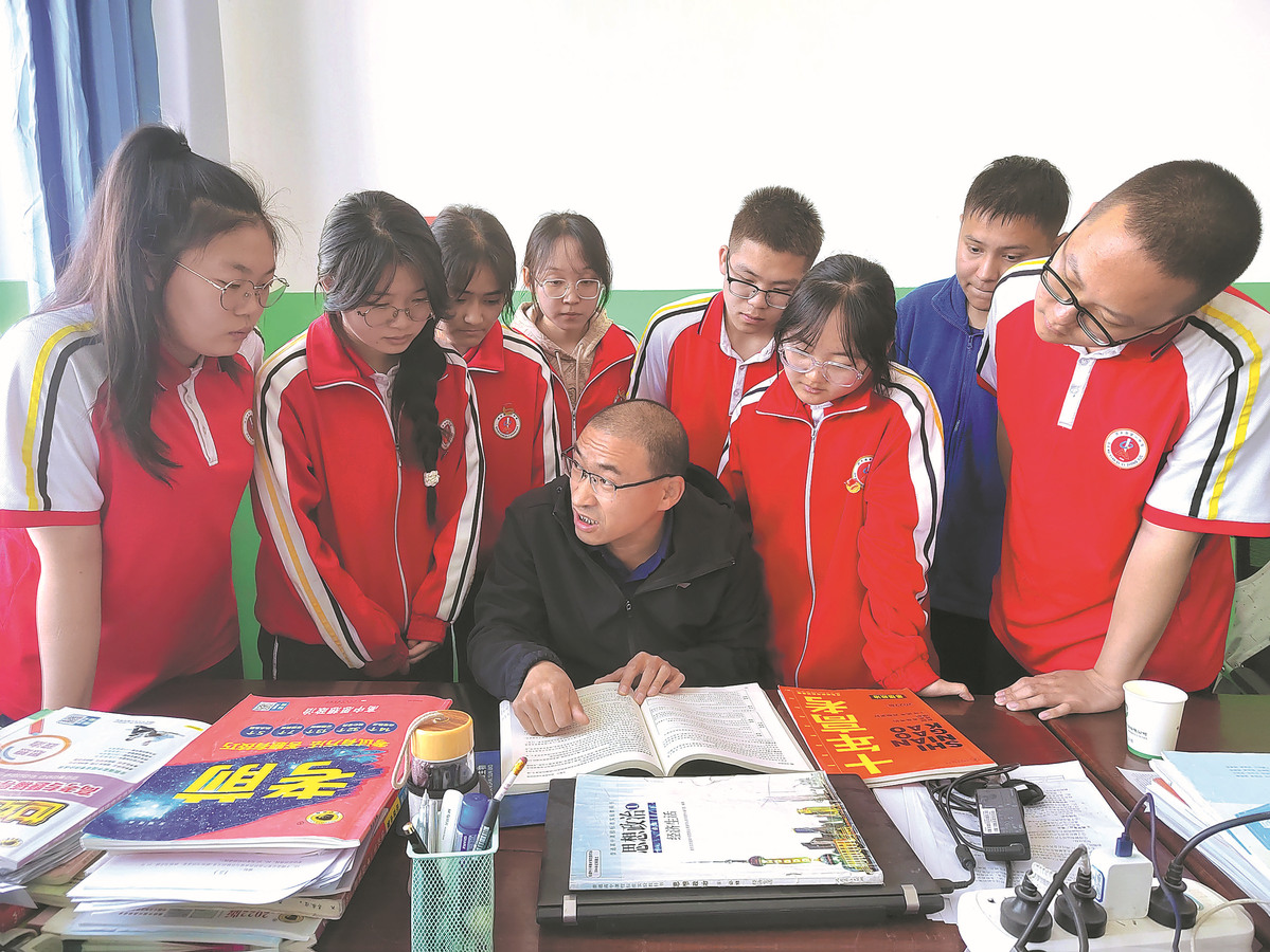 Панг Шенгли разговаря със своите ученици в гимназията № 1 в окръг Qiemo, автономен регион Xinjiang Uygur. Панг беше една от първите партиди от 15 възпитаници на университета в Баодинг, които доброволно преподават в Синдзян. [Photo provided to China Daily]