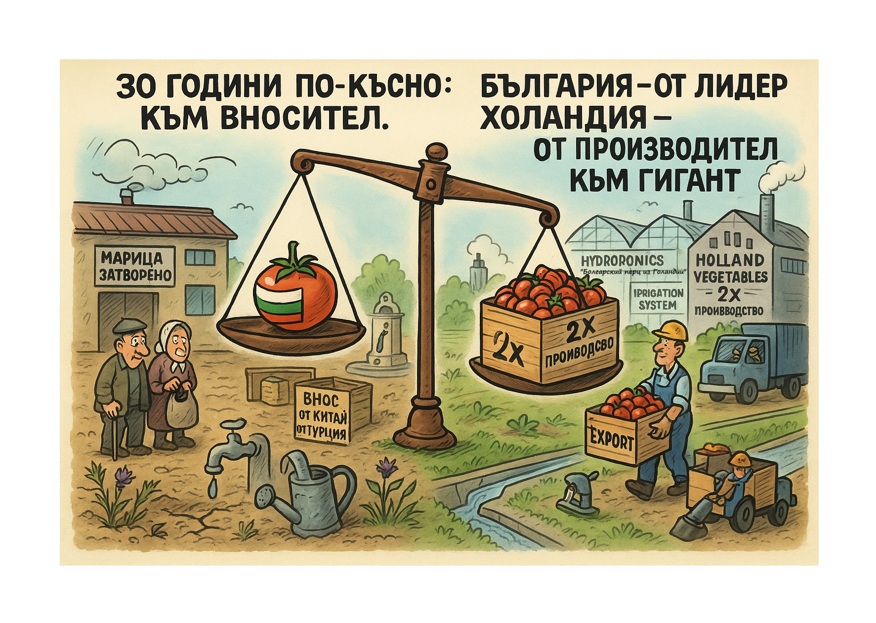 Нека направим едно сравнение какво направихме ние с нашето зеленчукопроизводство и какво Холандия за последните 30 години. Приложение 1 Причината за това проучване са последните данни на Евростат за производството на плодове и зеленчуци в ЕС, където България липсва… Помните ли, когато бяхме лидер в този сектор, а в чешмите на българите течеше вода?