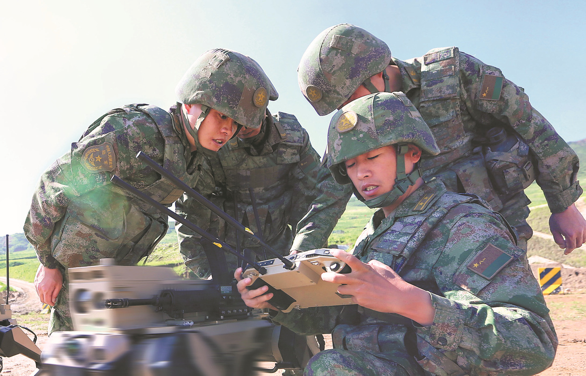 Джан Канан (вдясно) управлява военен дрон по време на упражнение със своите колеги войници. Cui huoyang/за China Daily
