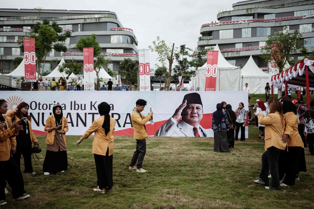 Плакат с портрет на индонезийския президент Прабово Субианто се вижда в Нусантара на 17 август. Снимка: AFP