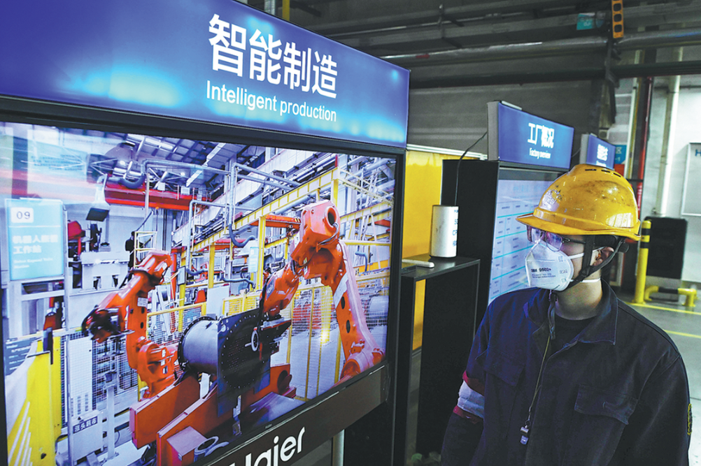 Служител обяснява как работят интелигентни роботи в производствената линия на фабриката за централна климатизация на Haier в Кингдао, провинция Шандонг, на 27 ноември. LI ZIHENG/XINHUA