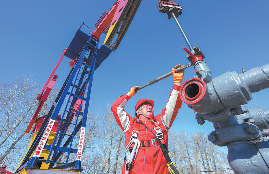 Служител извършва работа по поддръжката на оборудването на сондажна платформа в Дакинг, провинция Хейлундзян, 6 март. WANG SONG/XINHUA