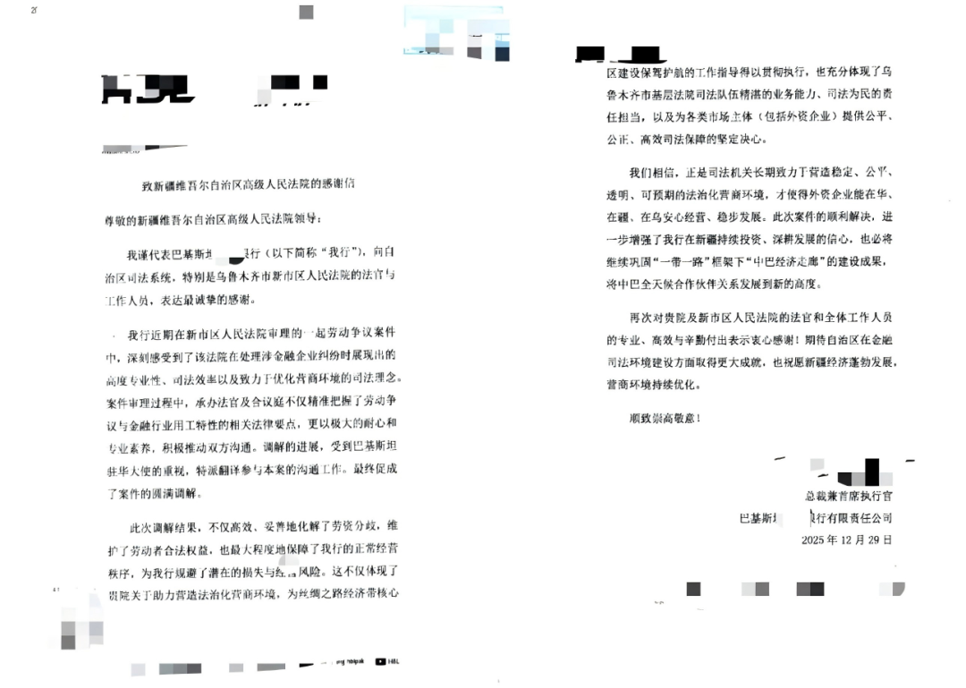 Пакистанска банка изпрати писмо до районния народен съд Синши в Урумчи, Синдзян, изразявайки благодарност за професионализма и ефективността на съдиите при разрешаването на трудов спор чрез медиация.