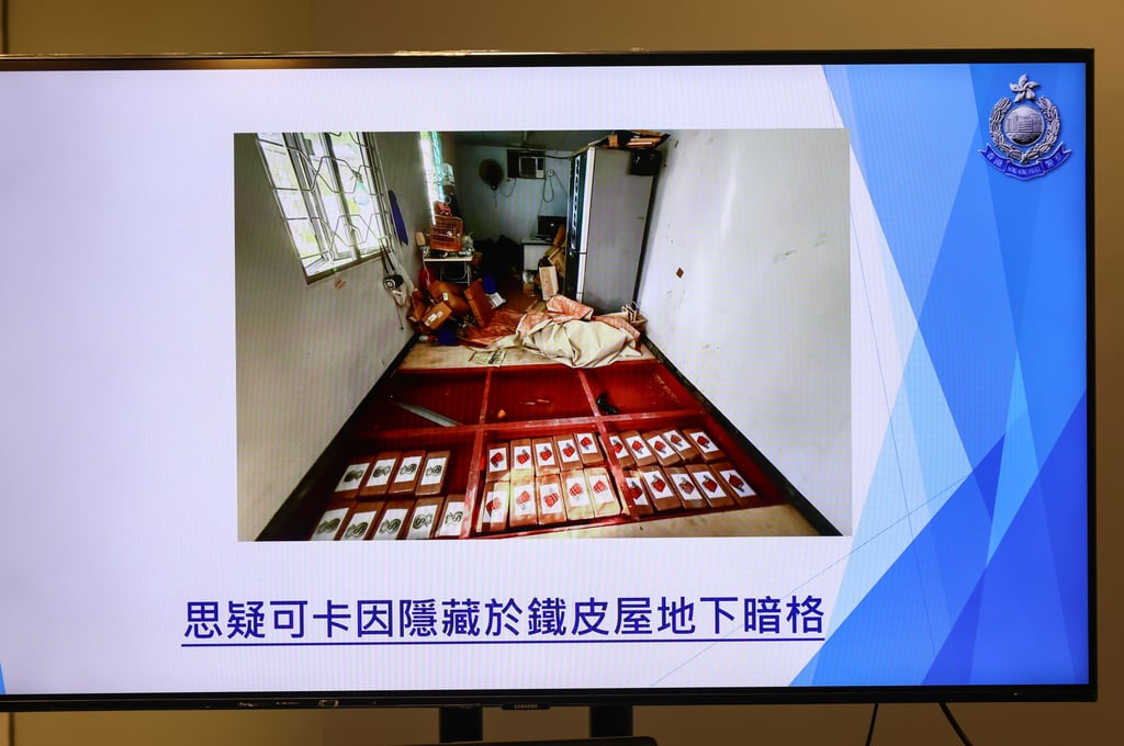 Общо 29 1 кг блока на заподозрян кокаин бяха открити скрити под дъските на пода в гофриран желязо на бара в Юен Лонг. Снимка: Диксън Лий