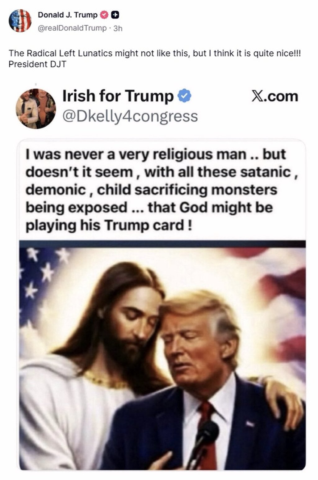 Изображението, публикувано повторно в акаунта на Тръмп в социалните медии, показва президента със затворени очи, докосващ храм до храм с подобно позирал Исус. Тръмп стои зад микрофон, а зад него има американско знаме.