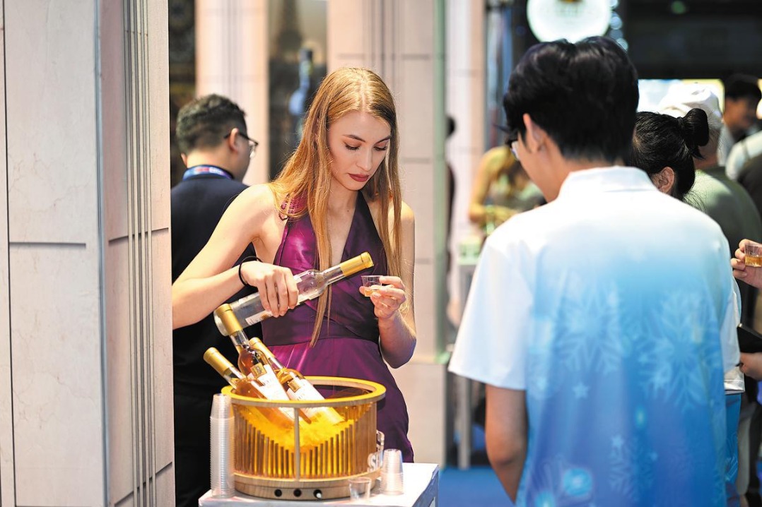 Служител на руския щанд налива вино, което посетителите могат да опитат в сряда, по време на 15-тото изложение Китай-Североизточна Азия в Чанчун, столицата на провинция Дзилин. [Photo provided to China Daily]
