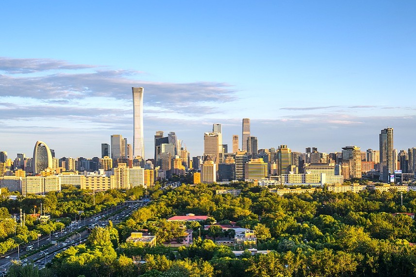 Далечен поглед върху силуета на Guomao CBD в квартал Chaoyang, Пекин, на 5 юли 2025 г. [Photo/VCG]