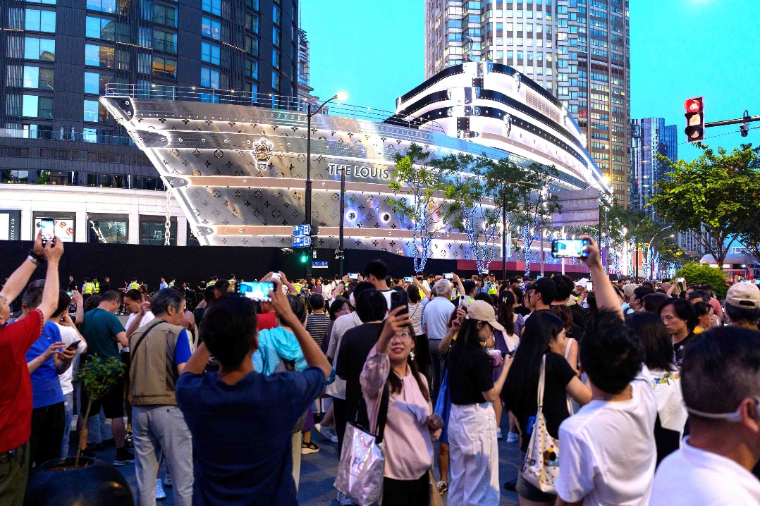 Луис Вуйтън разкри световния „първи„ Луис “, триетажна културна забележителност във формата на великолепна лодка LV, обхващаща 114,5 метра дължина и 30 метра височина. Състои се от дребно, Le Cafe Louis Vuitton и изложение на визионерите на Louis Vuitton. [Photo by Gao Erqiang/chinadaily.com.cn]