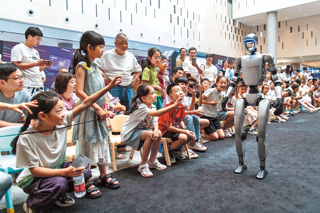 Посетителите си взаимодействат с хуманоиден робот на Unitree в музей на научните технологии в Джинхуа, провинция Жеджианг, на 27 юли. Ху Сяофей/за Китай всекидневник